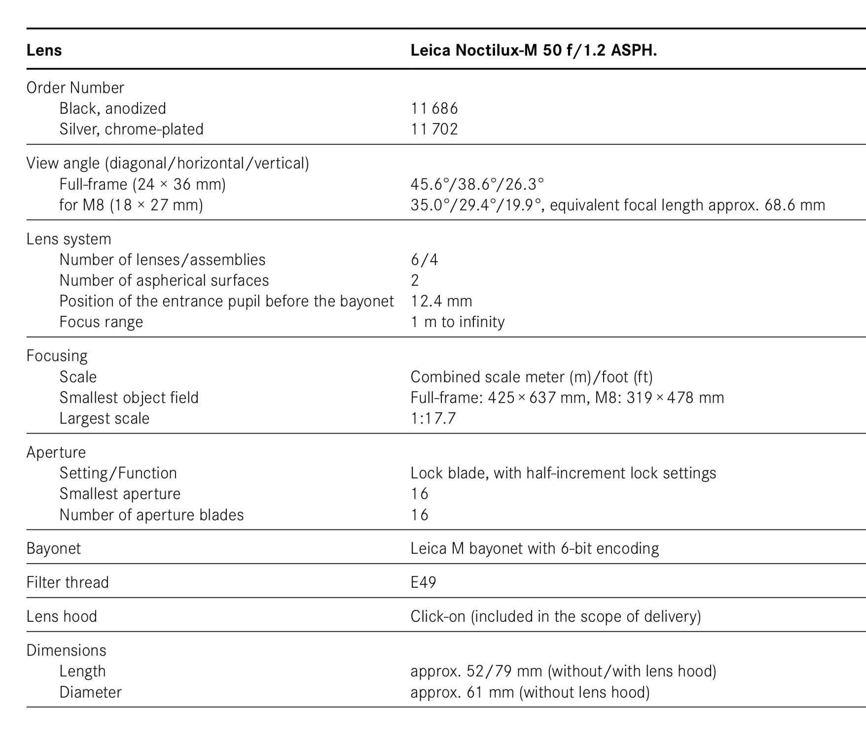 1966 년 Noctilux 50 f / 1.2 는 혁신적인 광학 특성으로 엑스포 방문객과 언론을 모두 놀라게 했다. 그 이유는 탁월한 광학 성능과 함께 동시대 기준으로 엄청나게 큰 최대 조리개를 제공했기 때문이다. 또한 이 Noctilux가 두 개의 비구면 렌즈를 포함하는 세계 최초의 양산형 렌즈라는 사실 때문이다. 그들의 목적은 최대 조리개에서 구면 수차를 줄이고 표현력을 향상시키는 것이었다. 이 상징적인 렌즈를 재발행하기 위해 원래의 계산과 구조는 최소한으로만 변경하었으며, 오늘날 사용 가능한 유리 유형과 생산 방법에 맞게 신중하게 조정되었다.